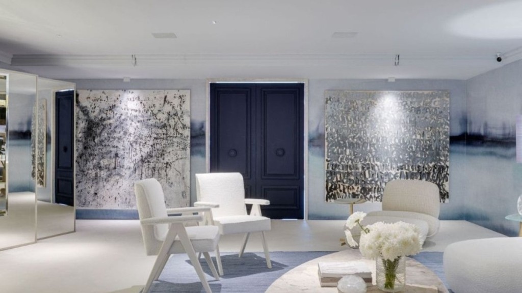 Um dos grandes destaques do projeto é o papel de parede coordonné no teto e nas paredes que utiliza a técnica milenar do Shibori – tipo de tingimento manual japonês. O elemento confere personalidade ao ambiente, ao mesmo tempo que serve de base para as obras de arte expostas na parede.