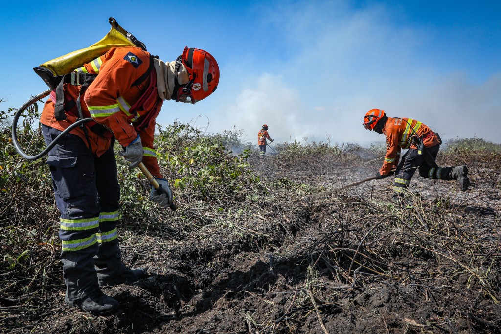Dentro do Parque Nacional do Pantanal Mato-grossense (Parna Pantanal), brigadistas do ICMBio e do Ibama combatem um incêndio próximo à divisa da Reserva Particular do Patrimônio Natural Estância Dorochê.
