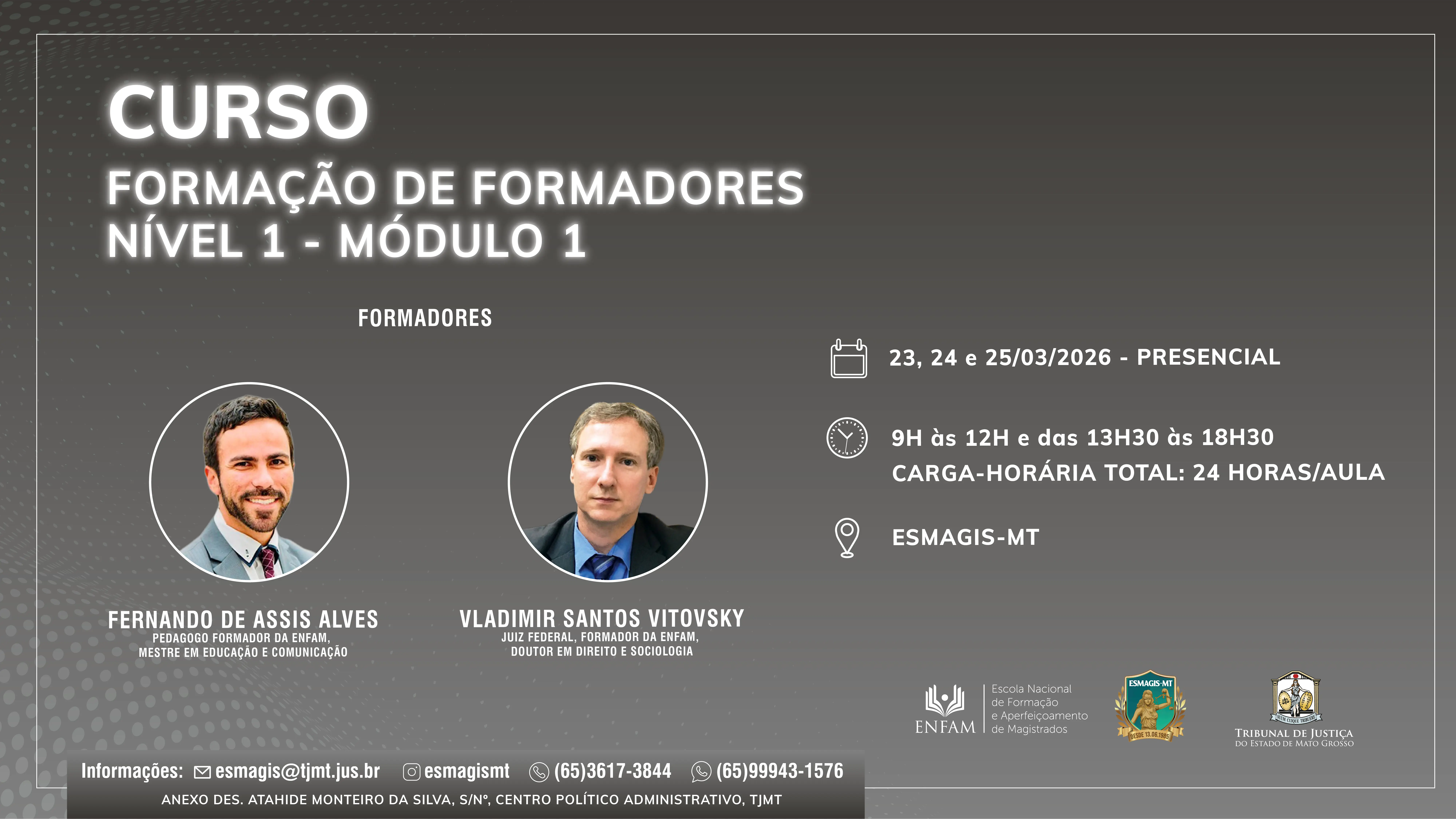 Os temas serão abordados pelos professores Fernando de Assis Alves (pedagogo e professor da Enfam) e Vladimir Santos Vitovsky (juiz federal no Rio de Janeiro, doutor em Direito e Sociologia pela Universidade de Coimbra e professor da Enfam).
