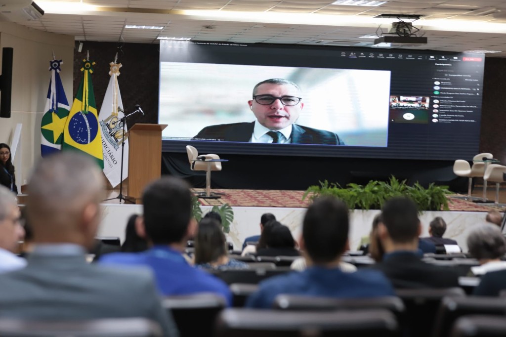 #Paratodosverem – Esta matéria possui recursos de texto alternativo para promover a inclusão das pessoas com deficiência visual. Descrição da imagem: Foto em plano aberto que mostra o auditório do TJMT, com a imagem do desembargador Humberto Dalla Bernardina no telão, proferindo sua palestra virtual, e o público sentado na plateia.
