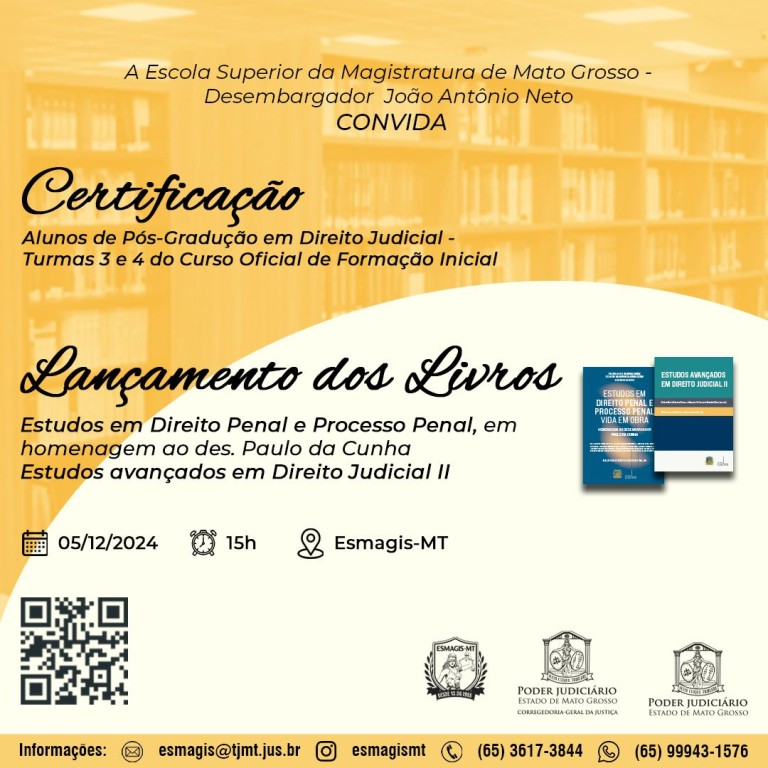 O primeiro, às 15h, na própria Esmagis-MT, certificará os alunos de Pós-Graduação em Direito Judicial, das turmas três e quatro do Curso Oficial de Formação Inicial (Cofi), voltado aos juízes substitutos de Mato Grosso. A abertura será feita pela desembargadora Helena Ramos.