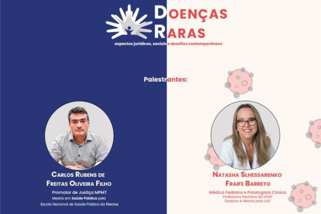A Procuradoria de Justiça Especializada na Defesa da Cidadania, Consumidor, Direitos Humanos, Minorias, Segurança Alimentar e Estado Laico promove, no dia 27 de fevereiro, o webinar “Doenças Raras: aspectos jurídicos, sociais e desafios contemporâneos”. O evento online é realizado pelo Centro de Estudos e Aperfeiçoamento Funcional (Ceaf) – Escola Institucional do Ministério Público de Mato Grosso, das 9h às 11h, por meio da plataforma Microsoft Teams, com transmissão ao vivo pelo canal institucional no YouTube.A programação inclui abertura oficial e duas palestras. Às 9h10, a médica pediatra e patologista clínica Natasha Slhessarenko Fraife Barreto apresentará os avanços científicos e os principais desafios contemporâneos envolvendo as doenças raras. A palestrante possui residência, mestrado e doutorado pela Universidade de São Paulo (USP), é professora da Universidade Federal de Mato Grosso (UFMT), e coordena, no Conselho Federal de Medicina, as Câmaras Técnicas de Segurança do Paciente e de Doenças Raras. Em seguida, às 10h10, o promotor de Justiça Carlos Rubens de Freitas Oliveira Filho, doutorando e mestre em Saúde Pública pela Escola Nacional de Saúde Pública da Fiocruz, abordará os aspectos jurídicos relacionados ao tema. Após cada exposição, o público poderá enviar perguntas e esclarecer dúvidas.Os participantes receberão certificado emitido pela Escola Institucional do MPMT, mediante assinatura da lista de presença.