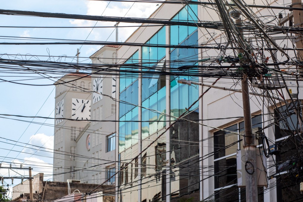 A imagem mostra um dos emaranhados de fios na região central de Cuiabá.