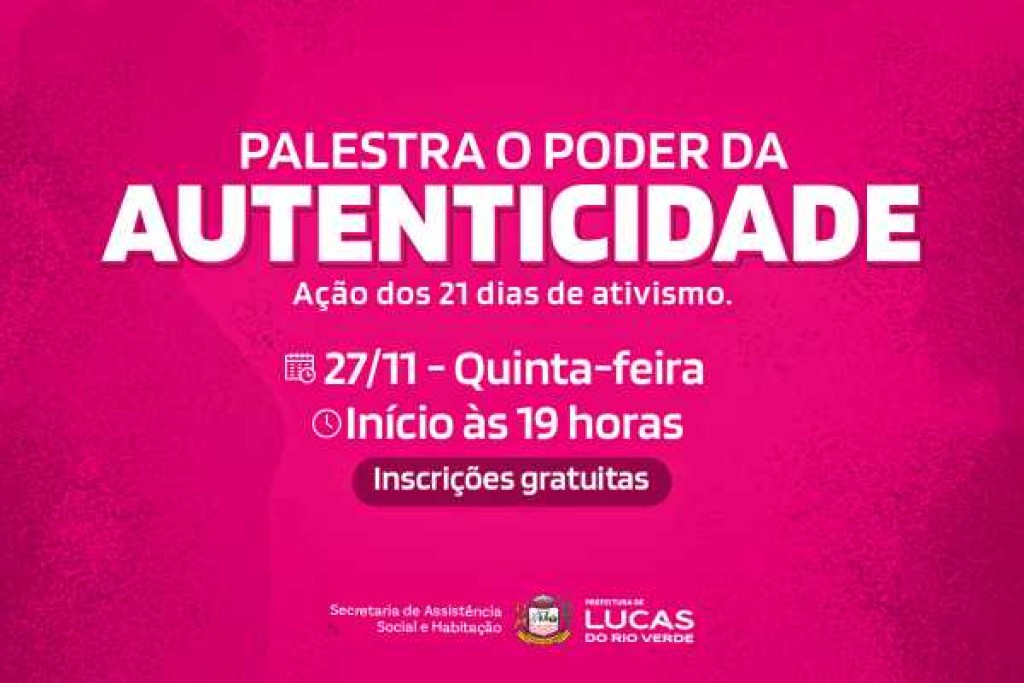 A campanha dos 21 Dias de Ativismo segue com um momento especial em Lucas do Rio Verde: o evento “O Poder da Autenticidade”, que acontece no dia 27 de novembro, às 19h, no Auditório do Paço Municipal. A entrada é gratuita.