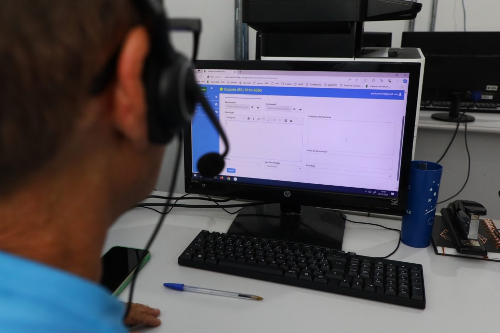 A imagem mostra um servidor usando fone de ouvido na frente do computador. Ele monitora as denúncias relacionadas a poluição sonora.