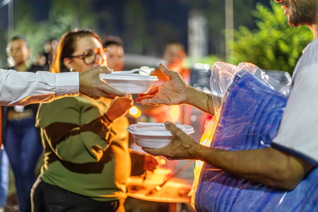A foto ilustra a secretaria municipal de Assistência Social, Helida Vilela, numa praça pública, entregando muma marmita a um morador em situação de rua.