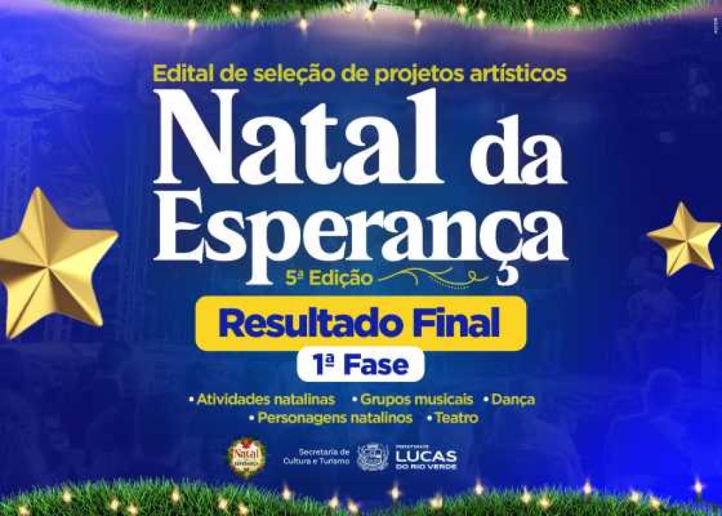 A Prefeitura de Lucas do Rio Verde, por meio da Secretaria de Cultura e Turismo, divulgou nesta terça-feira (28) o resultado final da primeira etapa dos projetos inscritos no Edital de Chamamento Público nº 06/2025, que selecionará produções artístico-culturais para compor o programa cultural da 5ª edição do Natal da Esperança.