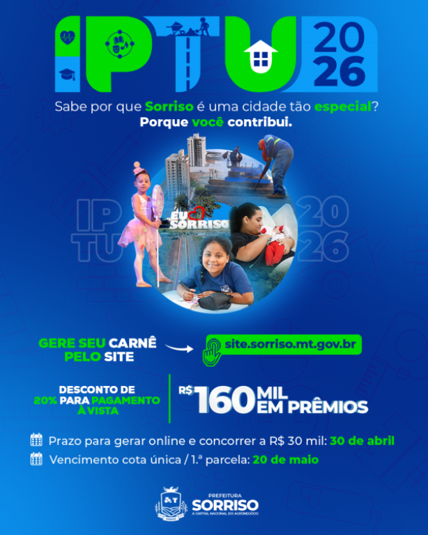 Por meio do decreto n.º 1.479, a Prefeitura oficializou o lançamento do Imposto Predial e Territorial Urbano (IPTU) de 2026. A exemplo dos anos anteriores, quem gerar a guia pela internet até o dia 30 de abril, já concorre a um prêmio de R$ 30 mil. Para emitir o carnê pela internet, basta acessar o site da Prefeitura (site.sorriso.mt.gov.br), clicar no ícone “cidadão”, e, na sequência, em “IPTU online”.