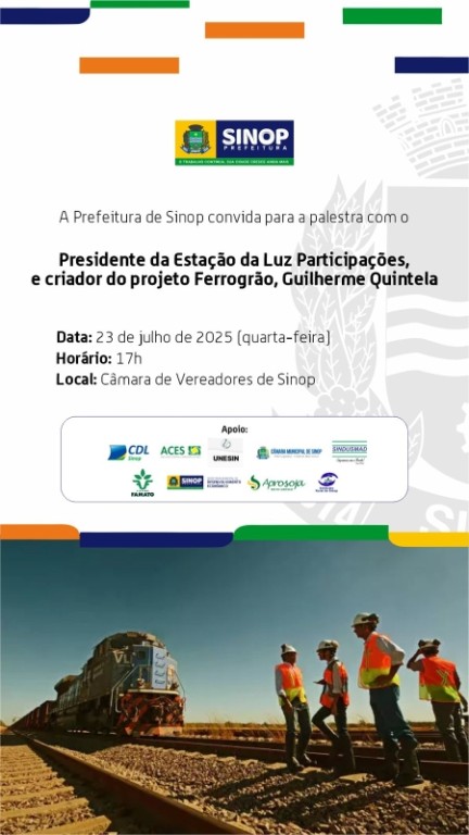 O evento tem como objetivo, expor, aos Poderes Executivo e Legislativo, bem como aos empresários do setor produtivo de grãos e sociedade em geral, como está o andamento do processo de implantação da linha que interligará o escoamento da produção de Mato Grosso, de Sinop ao porto de Miritituba (PA), após as decisões judiciais do Superior Tribunal Federal (STF) e da Agência Nacional de Transportes Terrestres (ANTT).