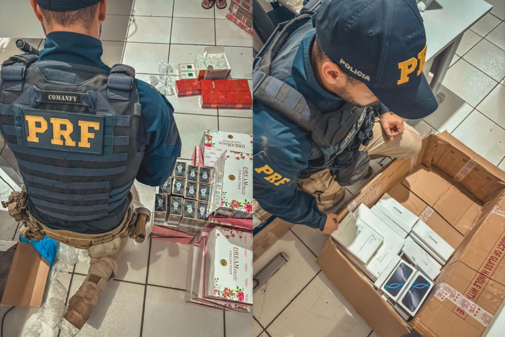 Além disso, foram encontradas duas caixas contendo eletrônicos de alto valor comercial sem qualquer comprovação fiscal, incluindo: 19 computadores tipo MacBook, 5 tablets iPad, 17 relógios Apple Watch, 5 celulares iPhone 16 de 256GB.