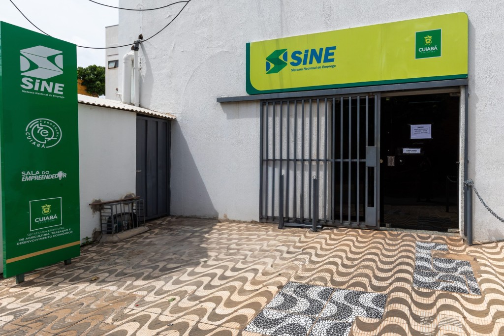 A imagem mostra a entrada do Sine Municipal de Cuiabá, com a fachada em destaque, na cor amarela e a palavra Sine em azul. Há um calçamento até a porta de vidro.