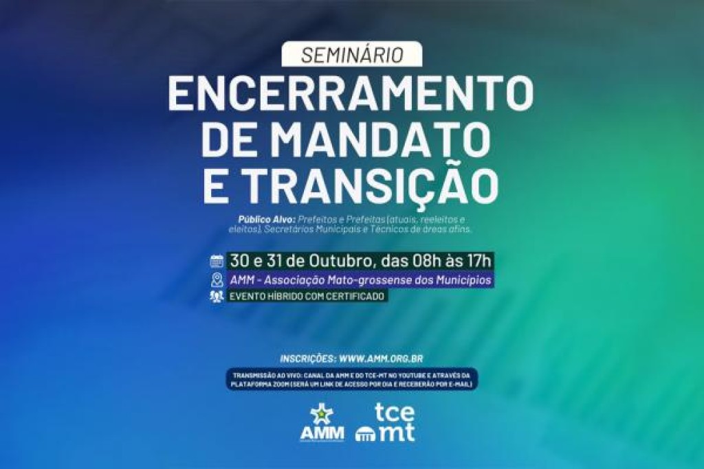 O Tribunal de Contas de Mato Grosso (TCE-MT) e a Associação Mato-grossenses dos Municípios (AMM) realizam, nesta quarta (30) e quinta-feira (31), o seminário “Encerramento de Mandato e Transição”. O encontro, que tem o objetivo de orientar os participantes do processo de transição das gestões municipais, será no auditório da AMM, com transmissão ao vivo pelos canais oficiais das instituições no YouTube e pela plataforma Zoom. Clique aqui e faça sua inscrição.